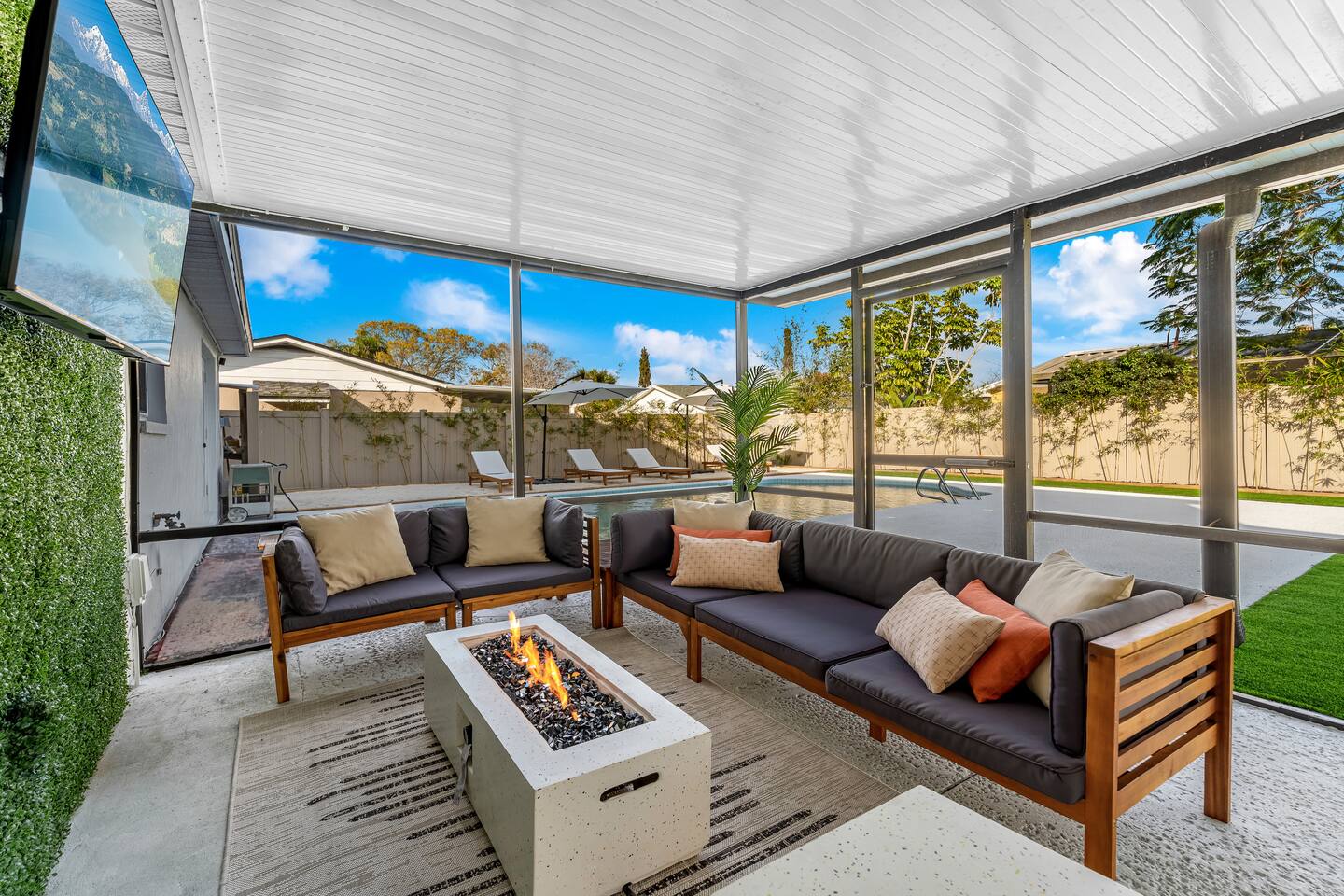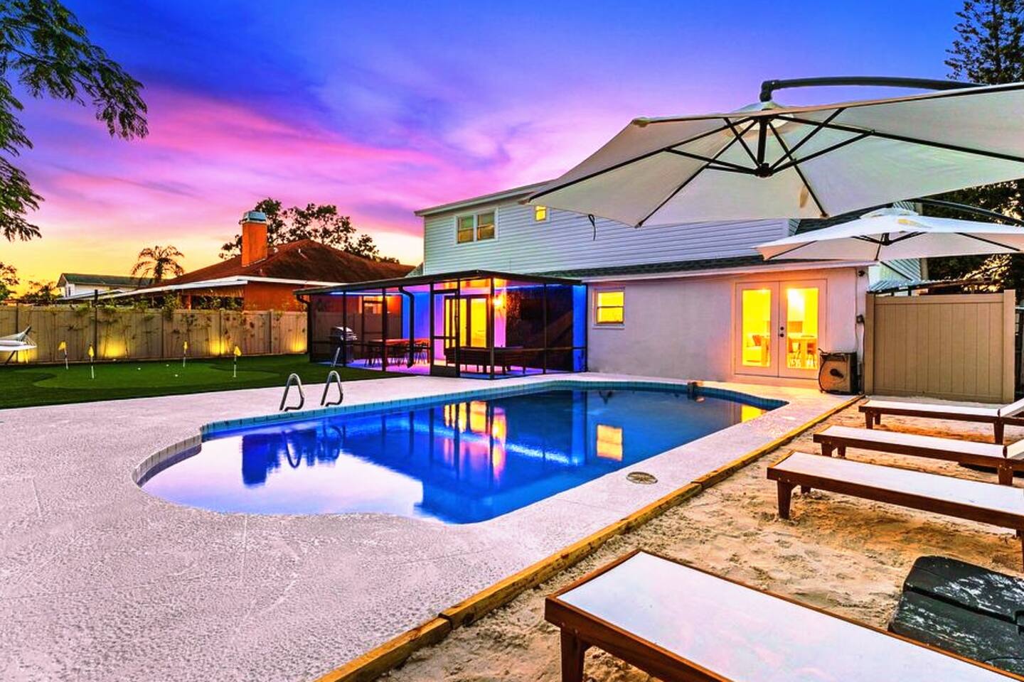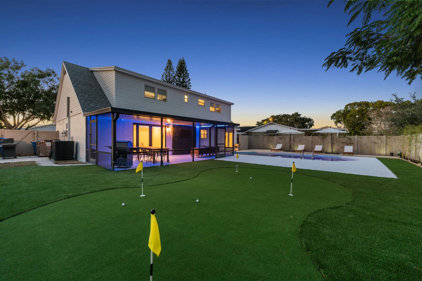 NEARBY: ➢ Tampa Airport (5.2 miles) ➢ Rocky Point Golf Course (1.7 miles) ➢ Ben T Davis Beach (5.2 miles) ➢ Countryway Golf Club (5.4 miles) ➢ International Plaza (5.7 miles) ➢ Raymond James Stadium (7.0 miles) ➢ Hyde Park Village / SoHo (8.7 miles) ➢ Tampa Zoo (8.9 miles) ➢ Downtown Tampa / Riverwalk (10.2 miles) ➢ Tampa Convention Center (10.6 miles) ➢ Amalie Arena (10.6 miles) ➢ Armature Works (10.7 miles) ➢ Sparkman Wharf (11.2 miles) ➢ The Florida Aquarium (11.3 miles) ➢ Ybor City (13.4 miles) ➢ Hard Rock Hotel & Casino (16.9 miles) ➢ Busch Gardens (18.0 miles) ➢ Clearwater Beach (21.2 miles) ➢ St. Petersburg (23.5 miles) ◀︎ ABOUT THE SPACE ▶︎ Step into a bright, open main living room designed for a fun and relaxing stay. The fully equipped kitchen features stainless steel appliances and everything you need for group meals, morning coffee, and late-night snacks. Dine indoors or take it outside to the screened lanai for alfresco meals under the Florida sky. Step through the French doors into your private backyard retreat: ✔ Heated pool ✔ Mini golf putting green ✔ Screened-in lanai with sectional seating ✔ Outdoor TV + firepit for movie nights ✔ Hammock + chaise loungers ✔ Grill for group cookouts Whether you're swimming, putting, roasting s’mores, or watching the game outside — this space was built for memory-making. ◀︎ SLEEPING ARRANGEMENTS ▶︎ BEDROOM #1 –- King Bed w/ ensuite bathroom BEDROOM #2 –- King Bed BEDROOM #3 –- Queen Bed + Foldable Twin Bed available as needed BEDROOM #4 –- 4 Queen Beds (2 Queen/Queen Bunk Beds) All Bedrooms Include: ✓ blackout shades ✓ memory foam mattresses ✓ smart tvs Bathrooms ✓ towels ✓ soap ✓ shampoo and conditioner Kitchen ✓ microwave, stove, oven ✓ toaster ✓ coffee machine ✓ electric kettle ✓ cookware ✓ dinnerware ✓ drinkware ✓ grill set Laundry Room ✓ washer ✓ dryer ✓ laundry detergent If you're looking for the ideal place to call home (away from home) just minutes from several main attractions and activities, look no further for your next stay in beautiful Tampa. We can’t wait to welcome you! * All TVs are smart TVs for online streaming with your personal account log in. * For safety, decorative fireplace does not emit heat. * Pack n play, high chair, child utensils/plates/cups, and toddler toys available upon request. * Please supervise children at all times, especially when outside around and near pool. Other things to note: We are fully compliant with Hillsborough County regulations and will provide any required documentation prior to check-in.